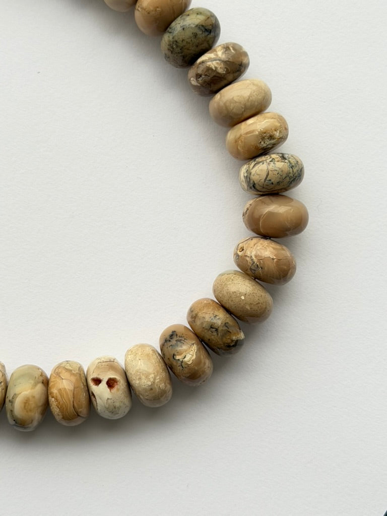 Collar elaborado con cuentas en tono arena pulida. Una pieza neutra y versátil que aporta calidez y textura a cualquier look. Perfecto para complementar tonos tierra, beige y prendas en fibras naturales.
